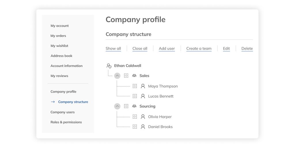U B2B modelu prodajete tvrtki, a ne pojedincu. To znači da proces kupnje često uključuje više odjela, uloga i razina odobravanja. Online trgovina mora omogućiti profile tvrtki s više korisnika unutar jednog računa, definirane uloge i odgovornosti te organizacijsku strukturu (sjedište, podružnice, odjeli).
