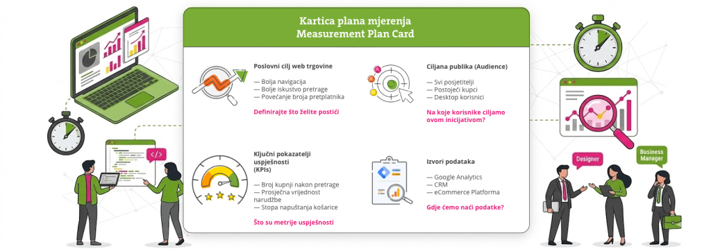 Na ovoj stranici se nalazi predložak za izradu kartice plana mjerenja (Measurement Plan Card) koji pomaže pretvoriti poslovni cilj web trgovine u jasan i mjerljiv plan praćenja rezultata. Kartica omogućuje da se za svaki cilj definiraju publika, ključni pokazatelji uspješnosti (KPI-evi) i izvori podataka, kako bi svi ljudi koji rade na razvoju eCommerce rješenja imali zajedničko razumijevanje što čini uspjeh pojedine inicijative i gdje se podaci nalaze.